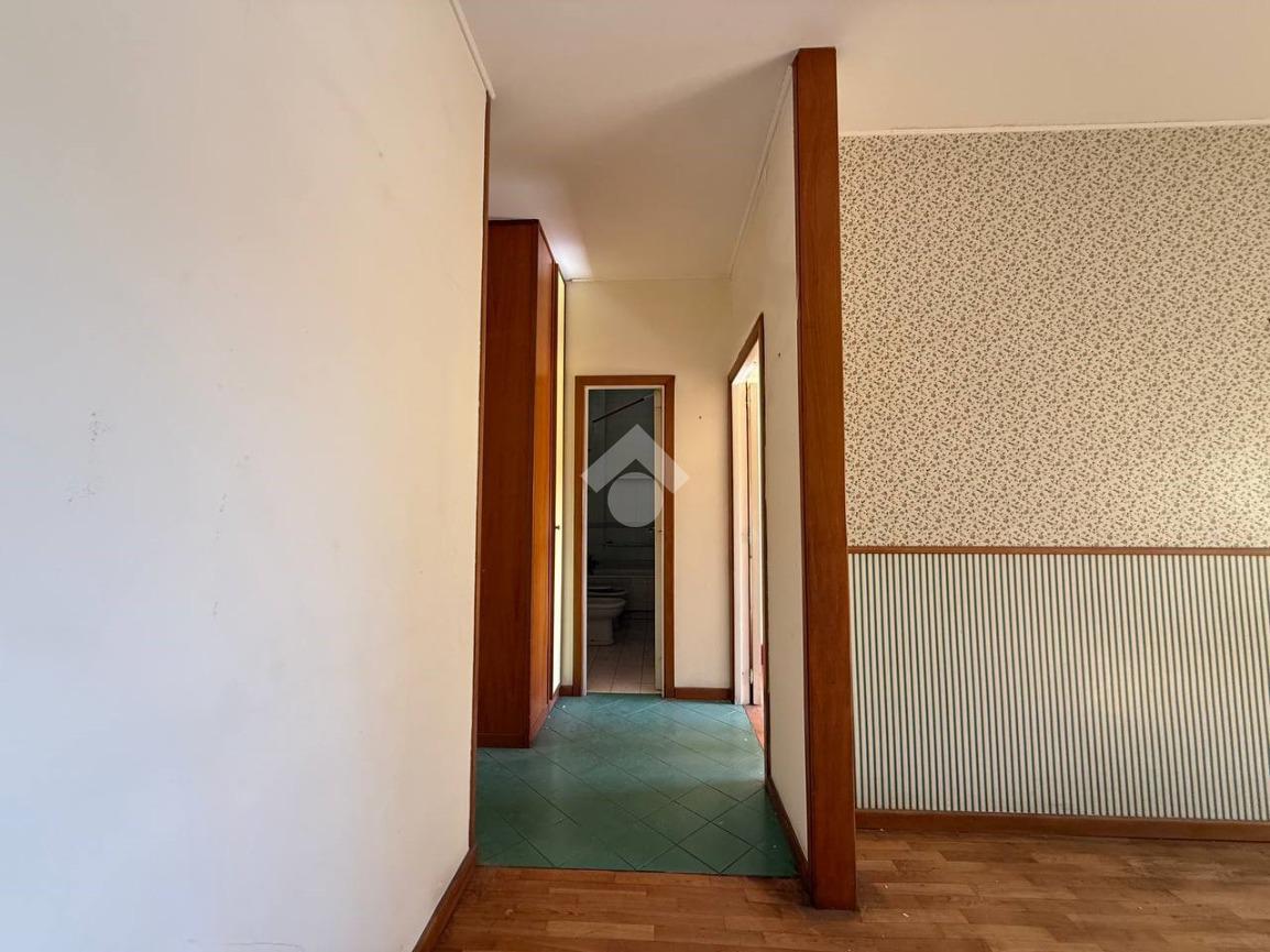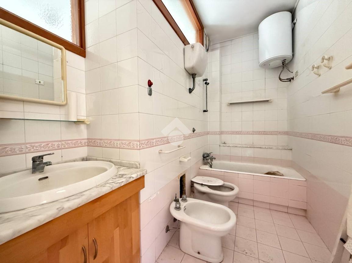 Vi è un ingresso in ampio disimpegno e salone luminoso, a seguire un corridoio conduce al bagno con vasca e alla zona notte; caratterizzata da due camere da letto, di cui una con vista mare, vi è una cucina abitabile con balcone.