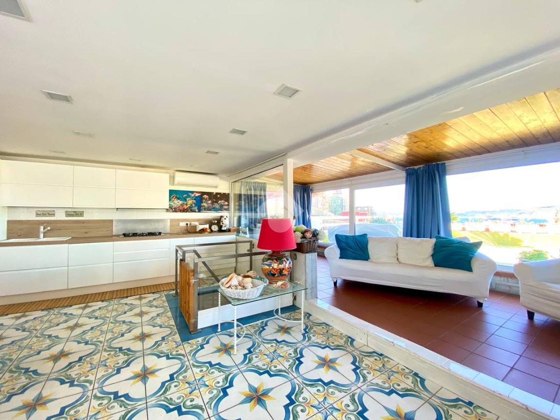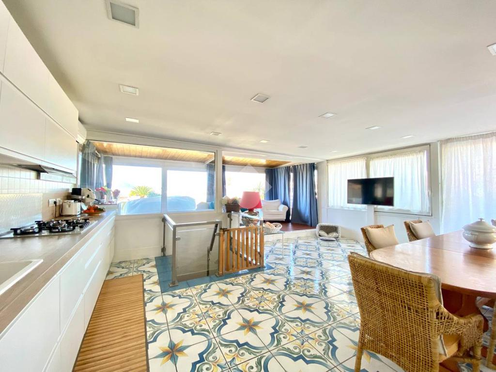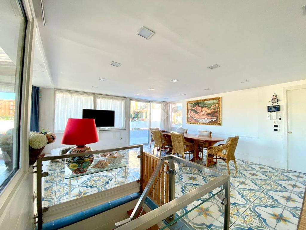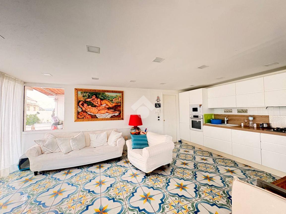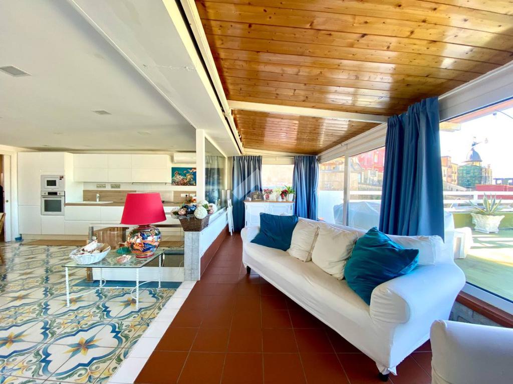 Al terzo livello vi è infine la zona giorno, il vero fiore all'occhiello della soluzione, composta da un soggiorno doppio con cucina angolo cottura, luminossissima, in quanto vi è un'ampia vetrata con esposizione sul terrazzo a livello, pavimentato, da cui è possibile godere di una splendida vista sul centro storico e sul Golfo di Pozzuoli.