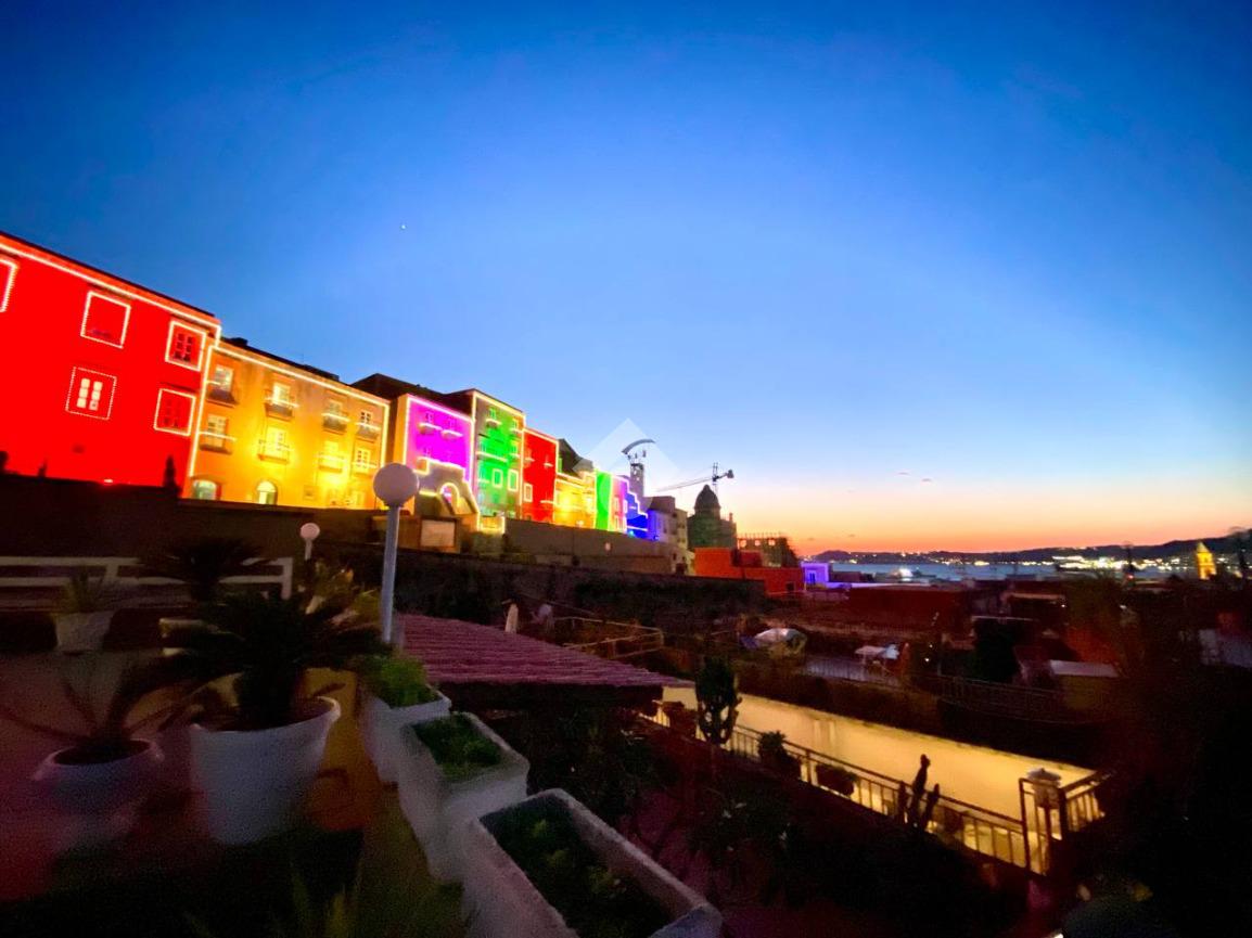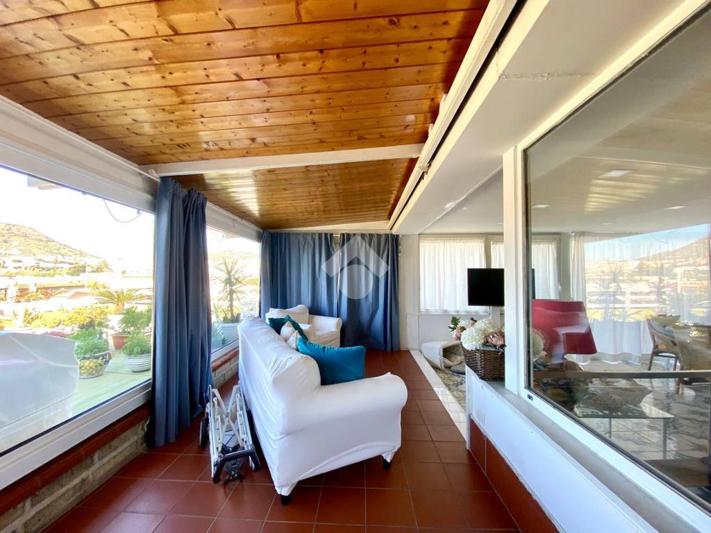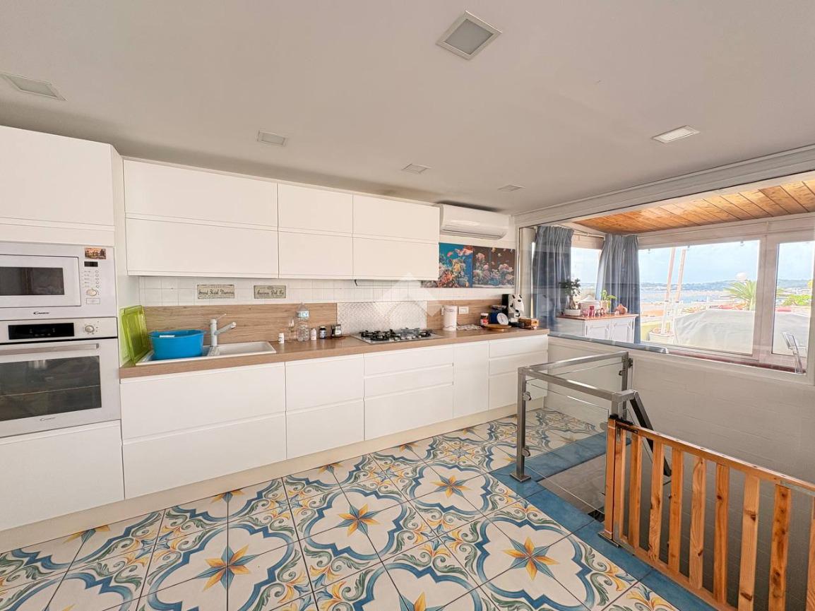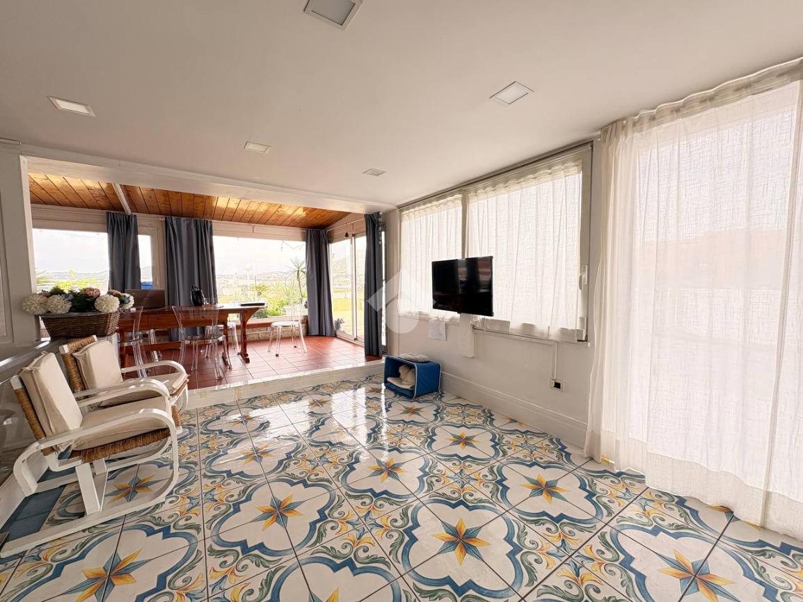 Al terzo livello vi è infine la zona giorno, il vero fiore all'occhiello della soluzione, composta da un soggiorno doppio con cucina angolo cottura, luminossissima, in quanto vi è un'ampia vetrata con esposizione sul terrazzo a livello, pavimentato, da cui è possibile godere di una splendida vista sul centro storico e sul Golfo di Pozzuoli.