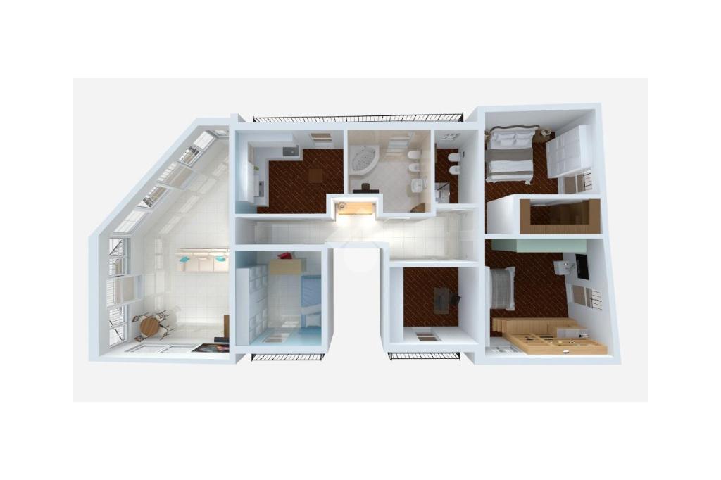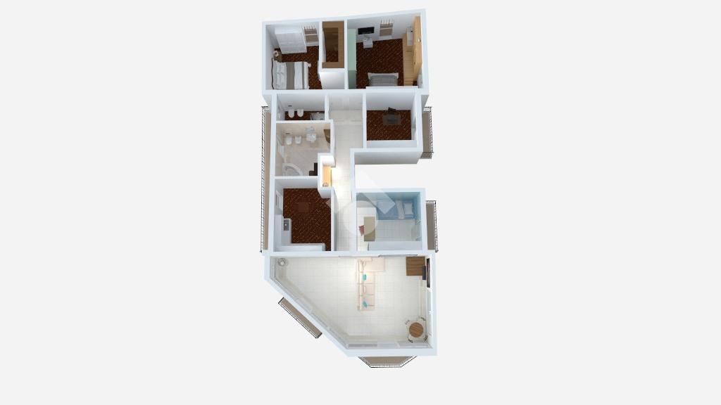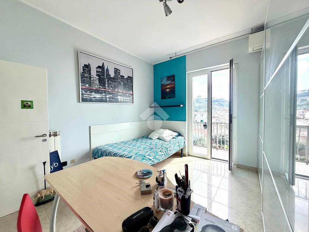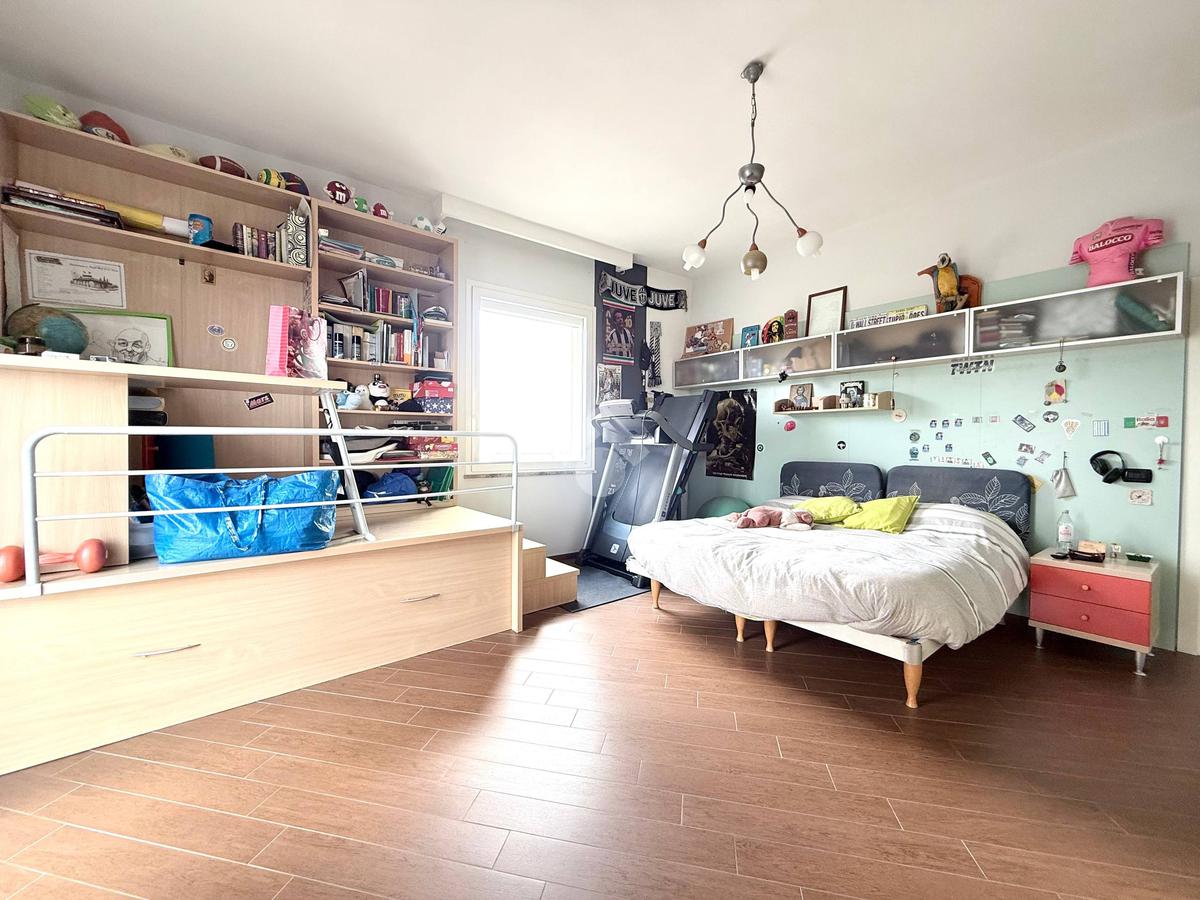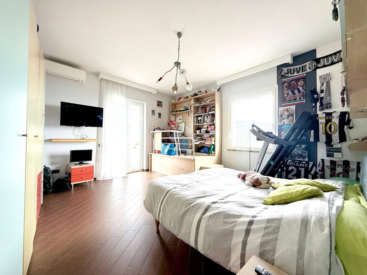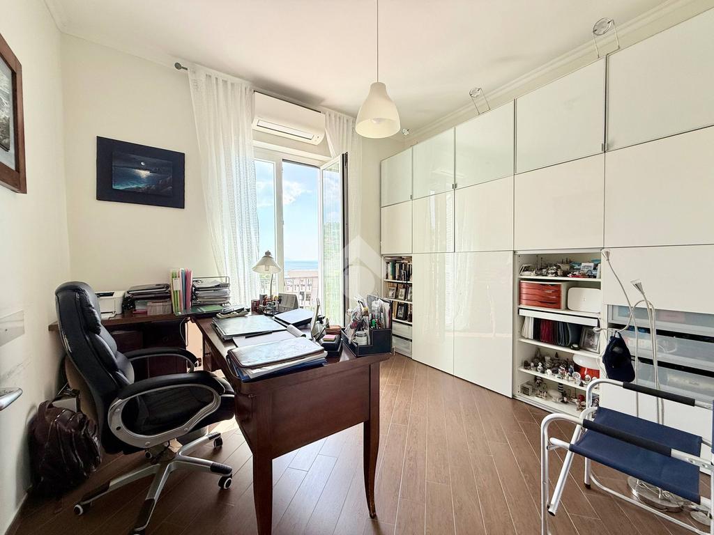 L'appartamento è dotato di ben tre camere da letto luminose, di cui una con cabina armadio e armadio su misura in muratura, uno studio con balcone panoramico, cucina abitabile anch'essa con balcone e doppio servizio con punto luce.