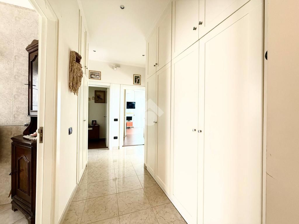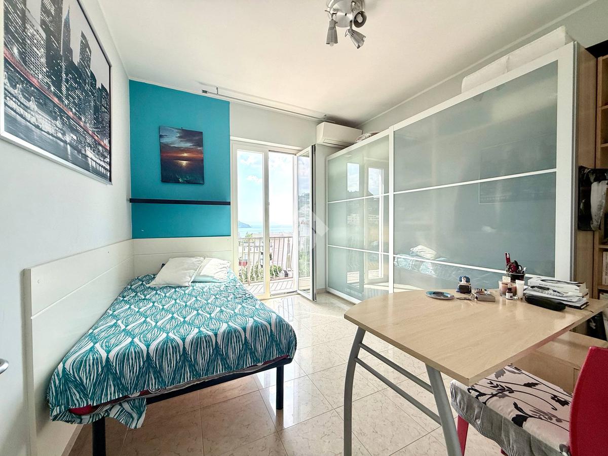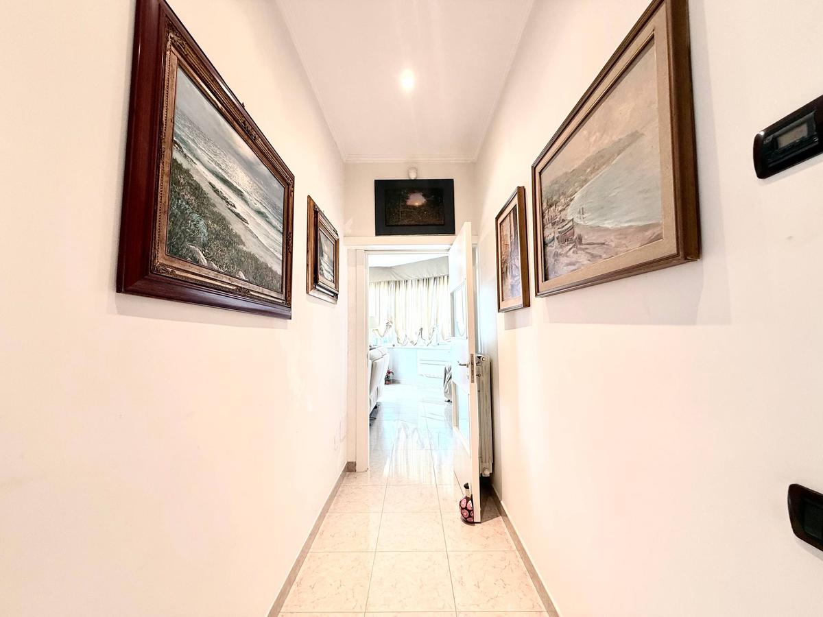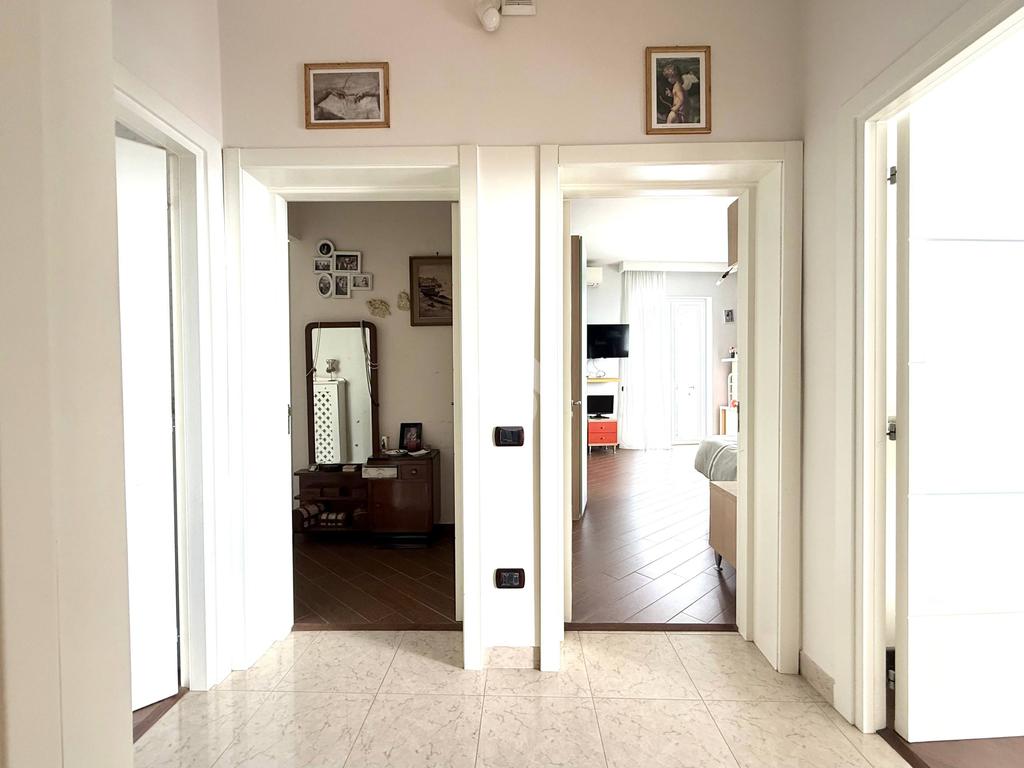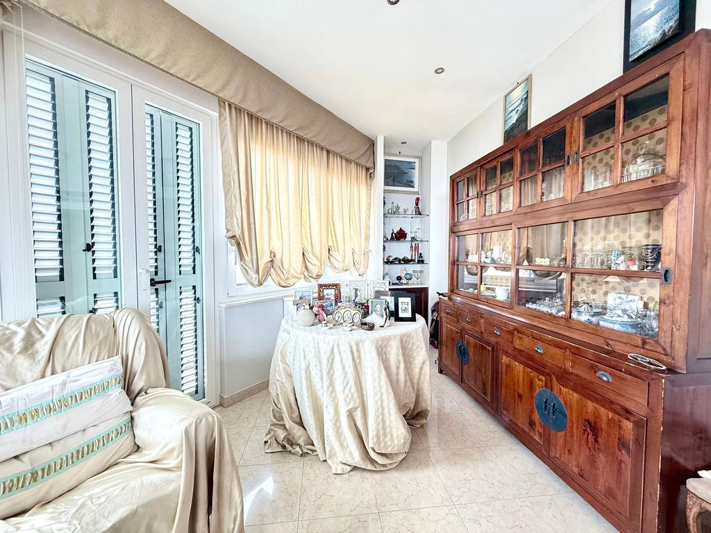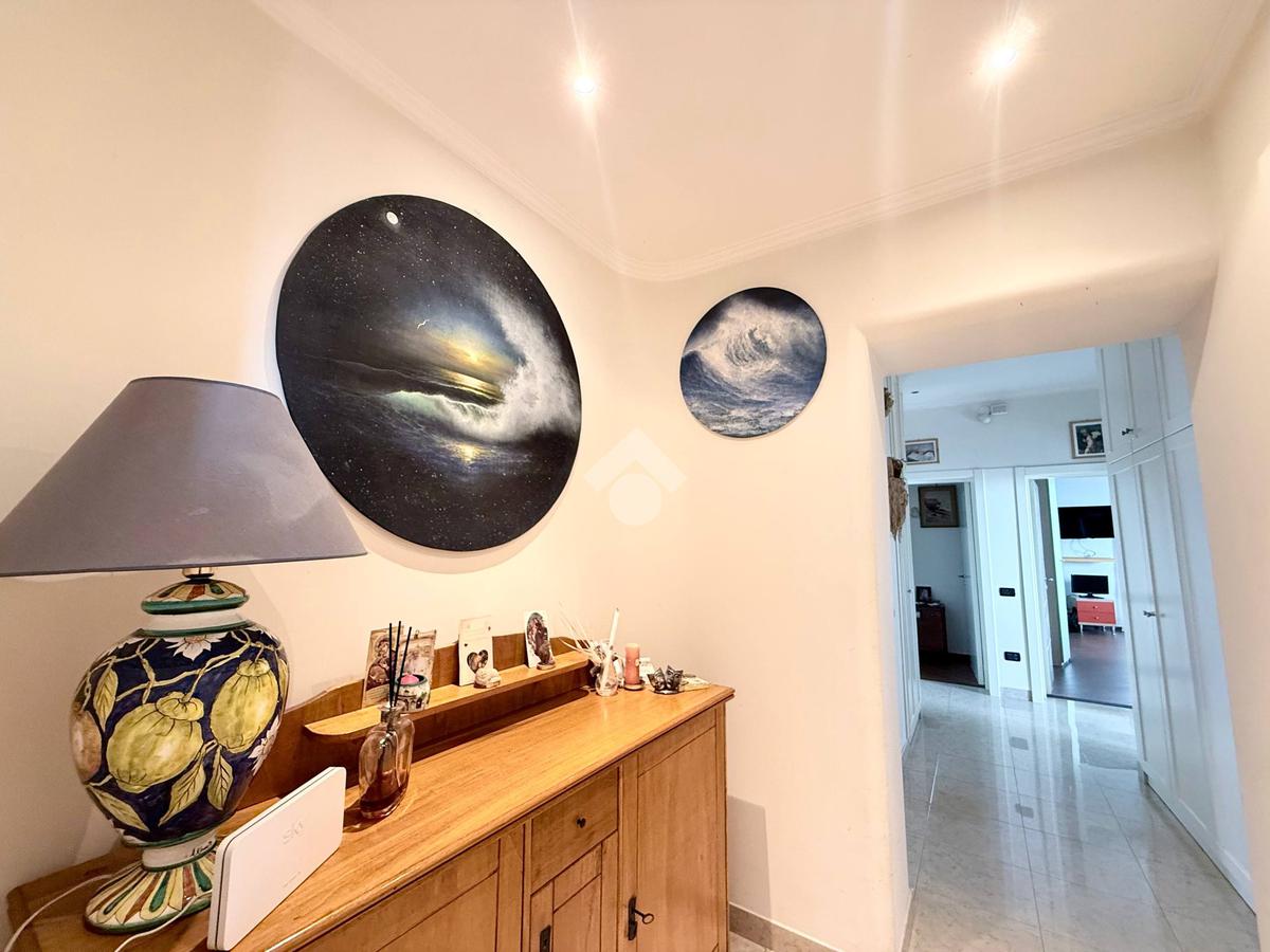 All'ingresso ci accoglie un piccolo disimpegno, segue un corridoio dove gli spazi sono stati ottimizzati grazie ad un'armadiatura su misura in muratura; proseguendo si arriva al cuore pulsante di casa ovvero un soggiorno doppio, con vista panoramica sul mare.