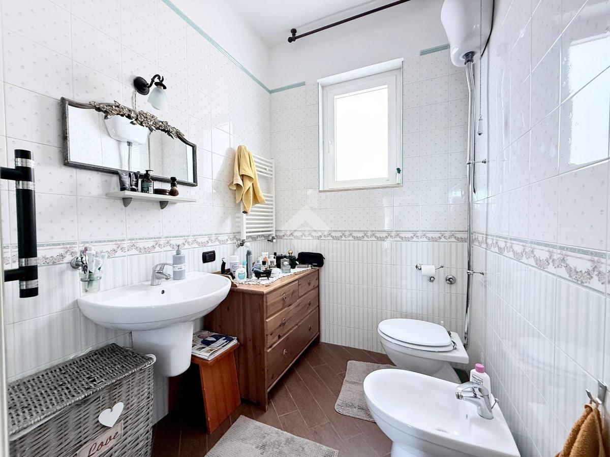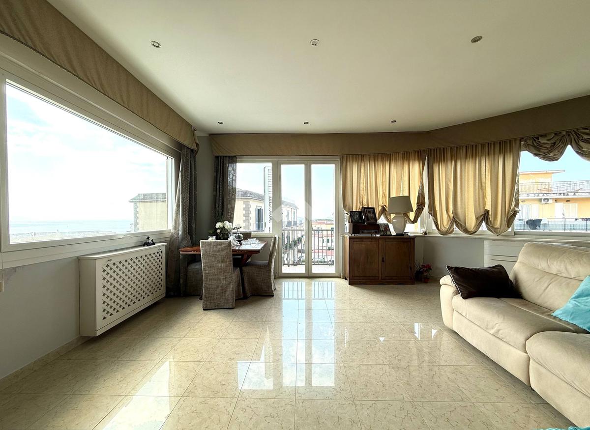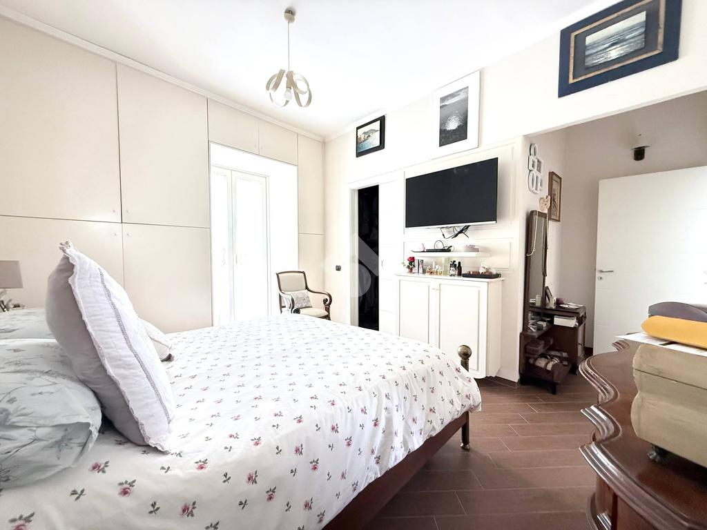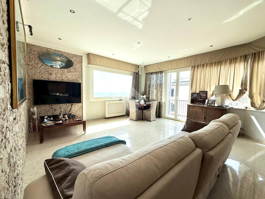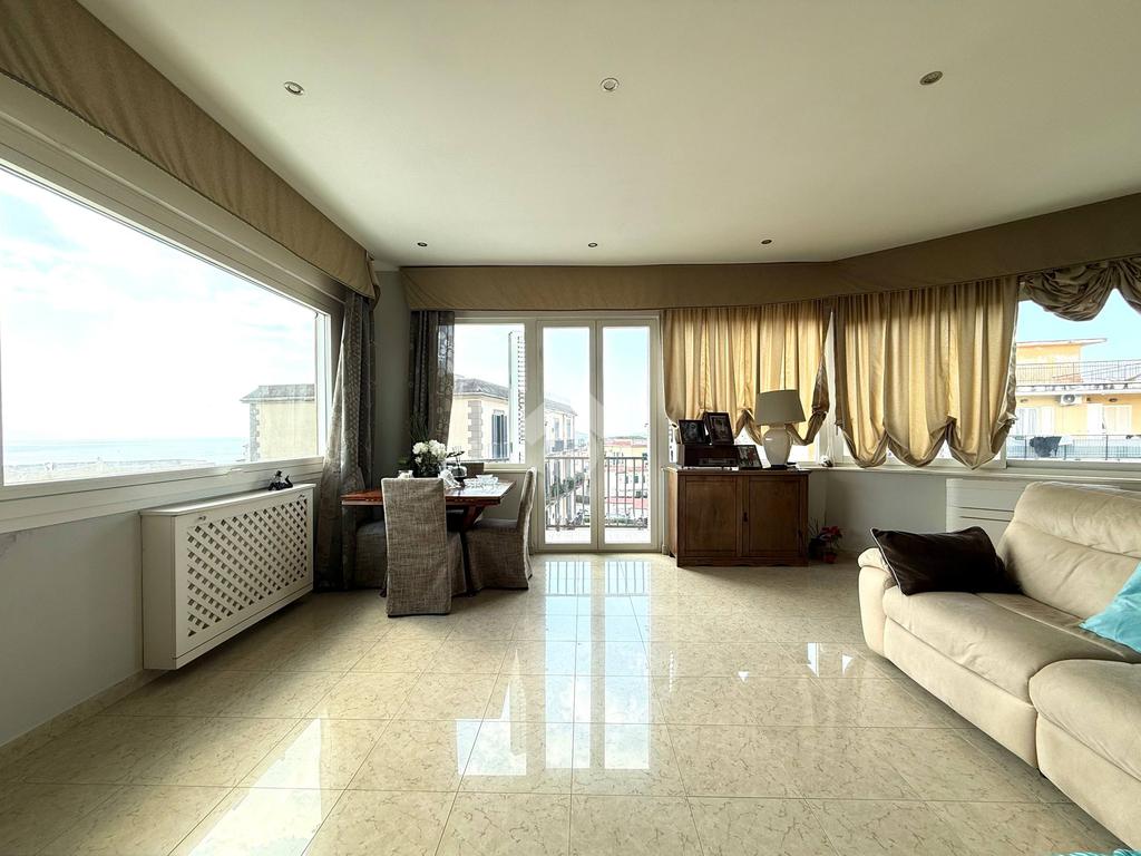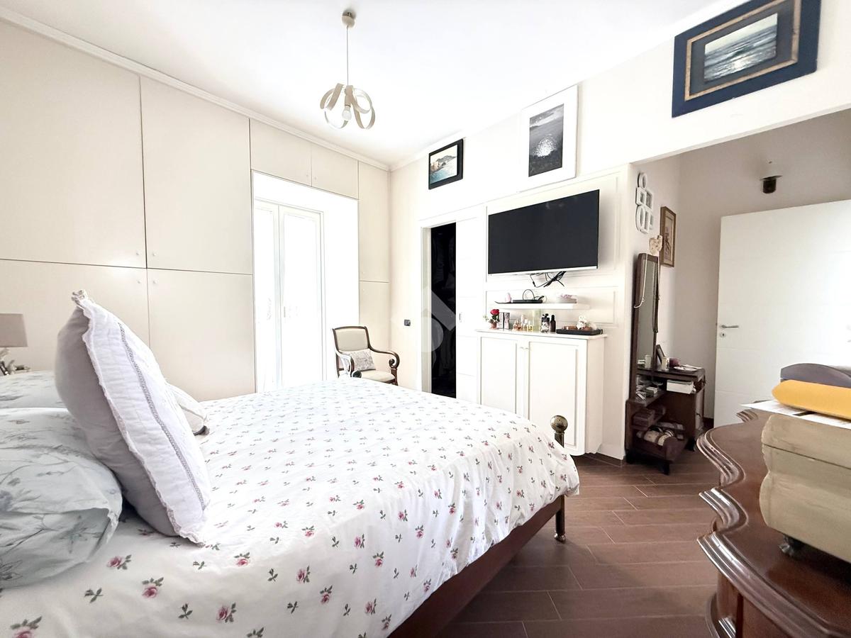 All'ingresso ci accoglie un piccolo disimpegno, segue un corridoio dove gli spazi sono stati ottimizzati grazie ad un'armadiatura su misura in muratura; proseguendo si arriva al cuore pulsante di casa ovvero un soggiorno doppio, con vista panoramica sul mare.